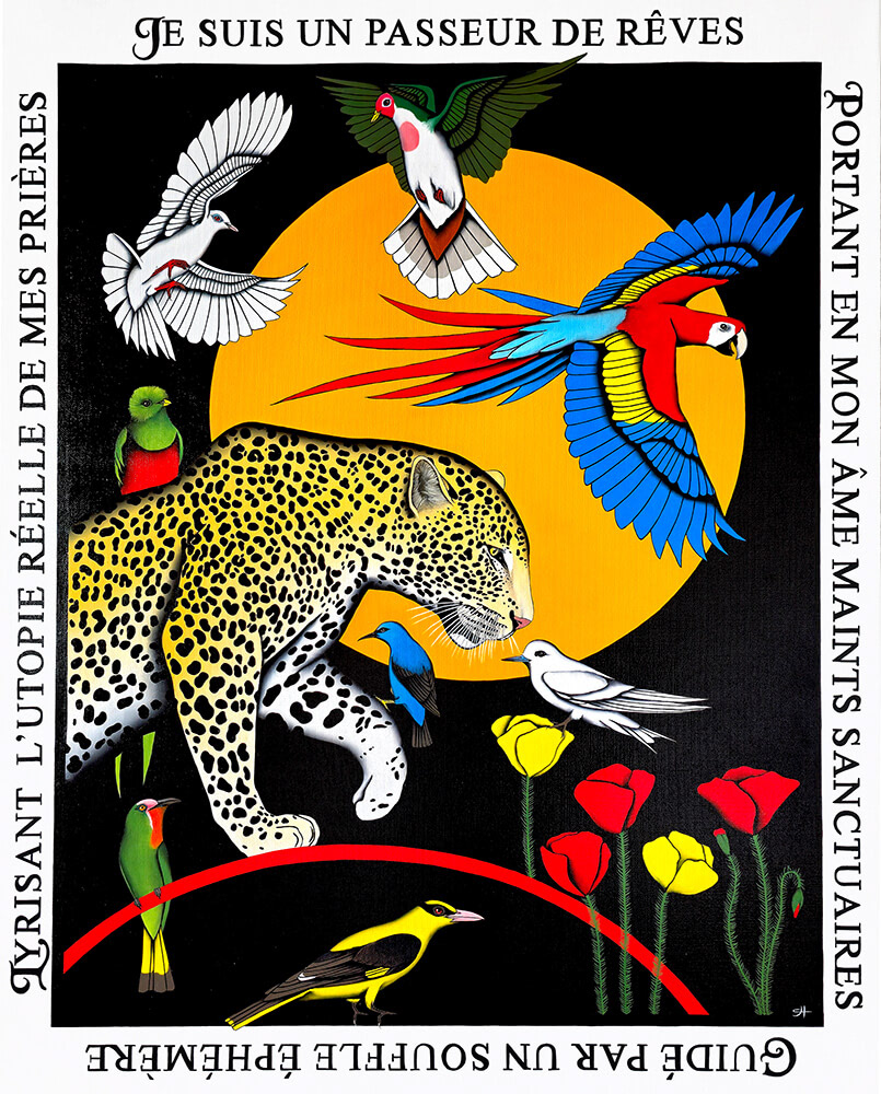 Le léopard est la métaphore d'une âme, marchant sur un pont céleste, entouré par l'immanence divine des ses propres rêves de lumière. Les oiseaux symbolisent l'éther.