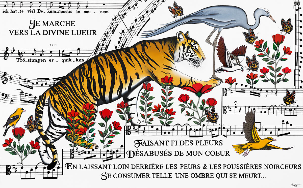 J'ai choisi de peindre des fragments de trois cantates. Les partitions derrière le dos du tigre sont issues des cantates BWV 21( Ich hatte viel Bekümmernis- J'avais grande affliction en mon cœur) et BWV 146 ( Wir müssen durch viel Trübsal -Il nous faut traverser bien des tribulations), elles symbolisent les afflictions et les épreuves de sa vie qui sont désormais passées et qui ont rendue son âme forte car elle a toujours vécu les épreuves avec la lumière...