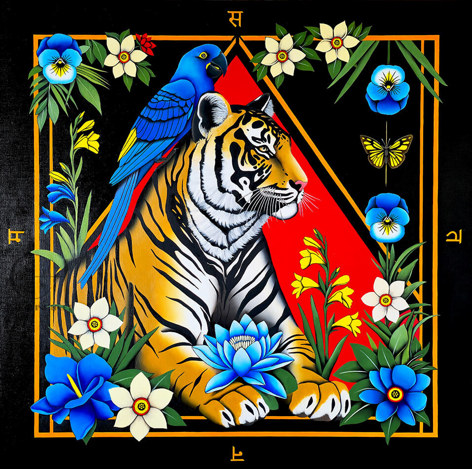 Le tigre est la métaphore de l’être en état méditatif. Il est entouré d’un oiseau bleu, symbolisant sont corps énergétique.