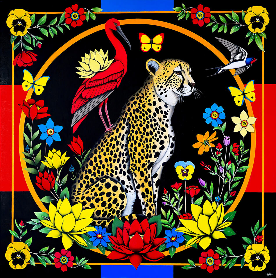 Cette peinture est une véritable symbolique. Le guépard est le symbole de l’âme, de notre âme, de votre âme. L’ibis rouge, incarne ici la sagesse, la fragilité, la beauté naturelle et la résilience.